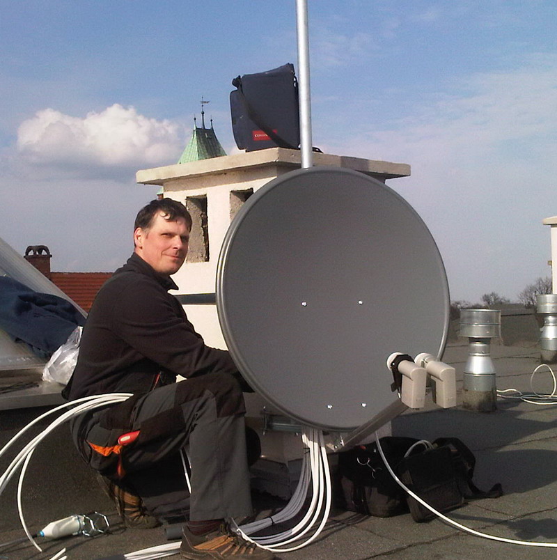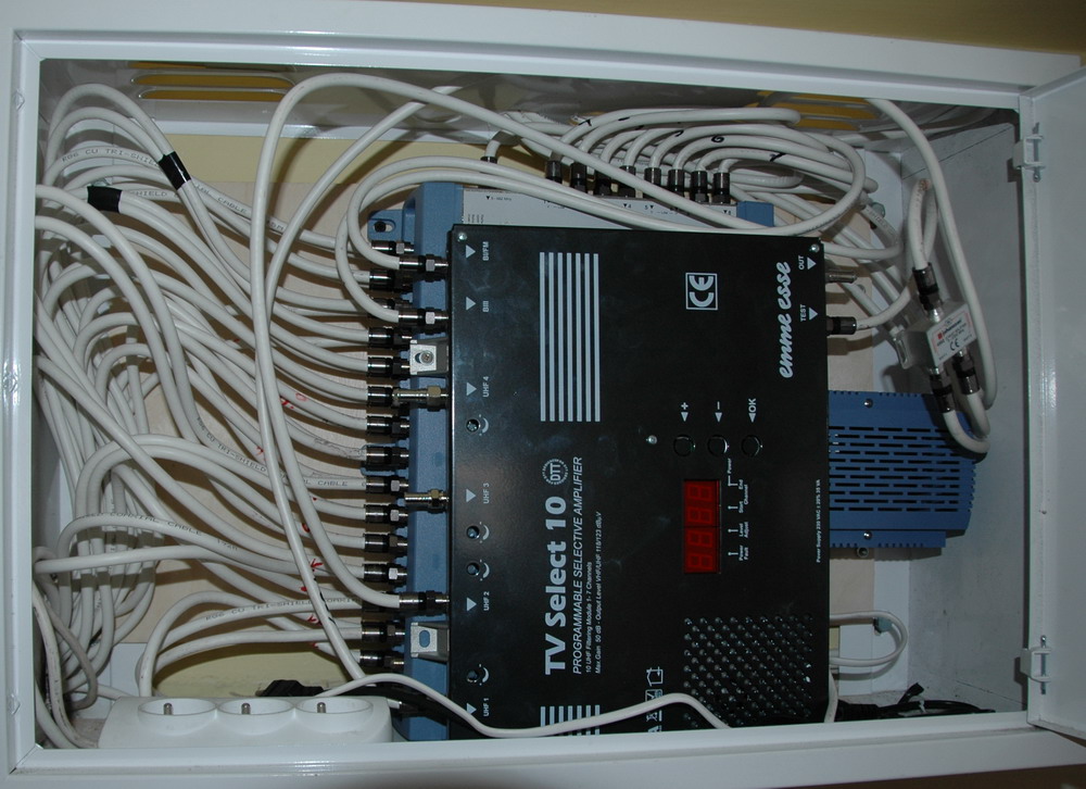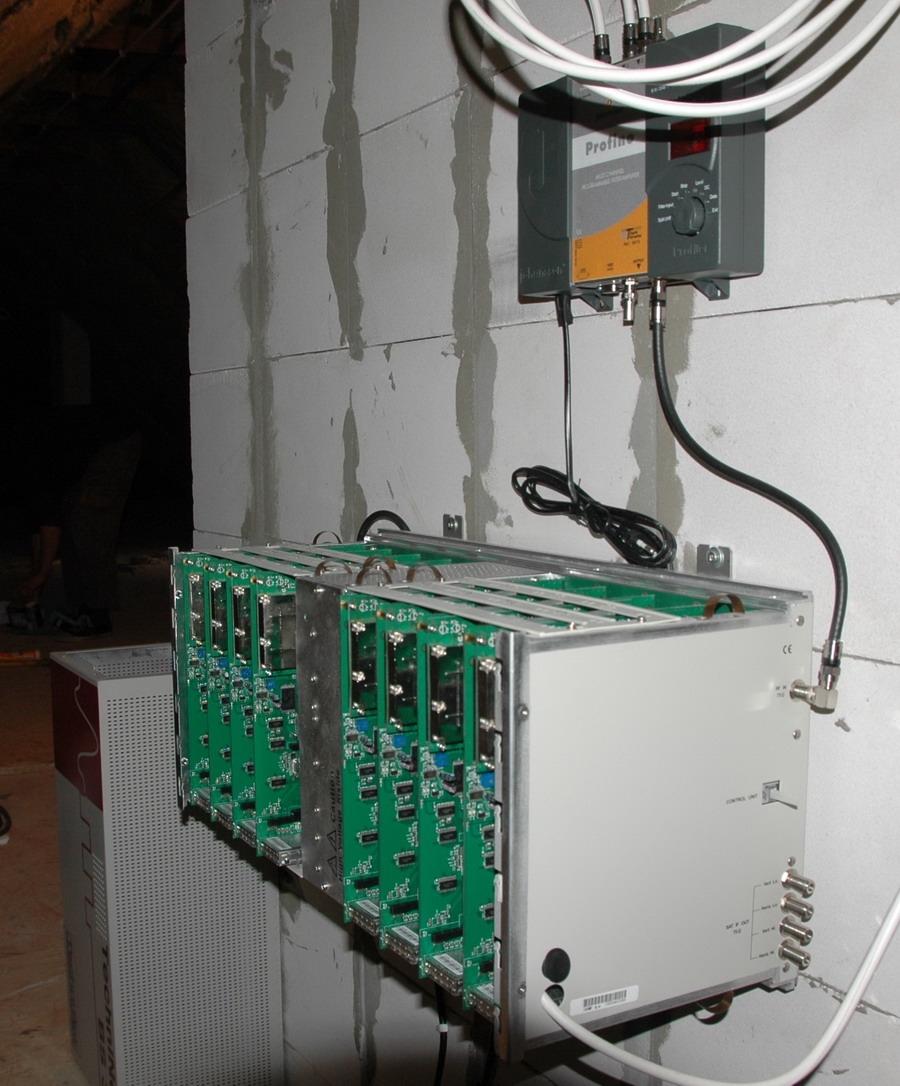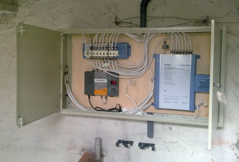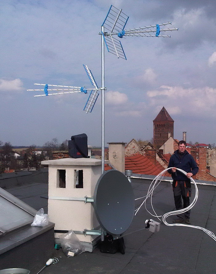 - Instalacja anteny zbiorczej w budynku wspólnoty mieszkaniowej Ruda Śląska Joliot Curie 1. 105 mieszkań, do każdego mieszkania po dwa przewody antenowe. Odbiór Astra + Hot Bird, DVB-T MUX1,2,3, czeskie, lokalny, Cyfrowy Polsat, UKF oraz DAB +. Jeden zestaw antenowy dla czałego budynku , dystrybucja na światłowodach.